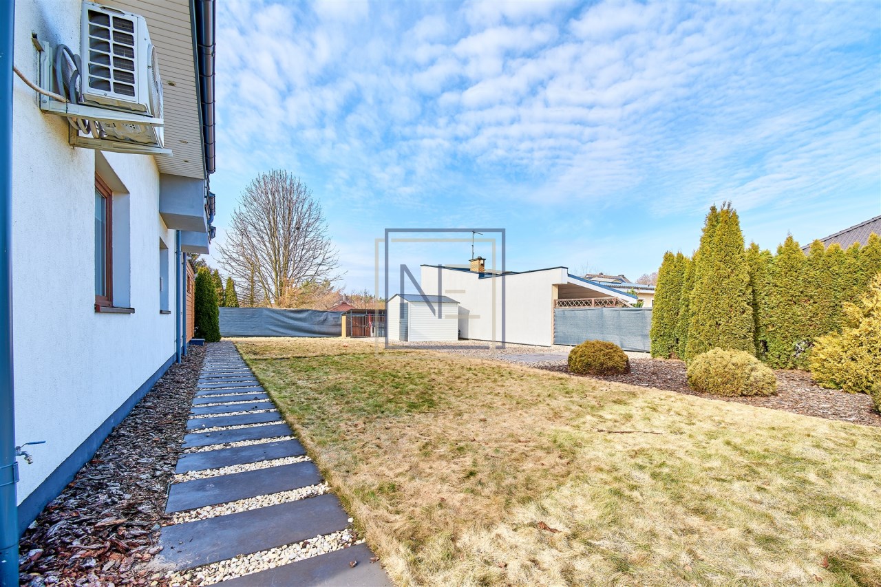 Powierzchnia całkowicie zagospodarowana z dużym tarasem, licznymi krzewami oraz narzędziownią.