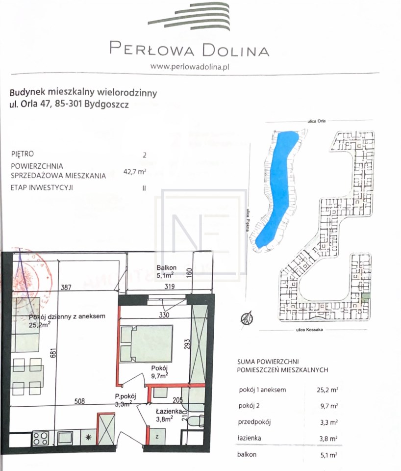 Nieruchomość wykazuje pole powierzchni użytkowej 42,7 m2.